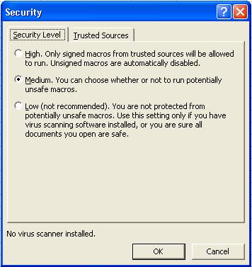 Make sure, as shown in the graphic below, that security is set to Medium.  If it is set on High, it must be changed or the Visual Basic code in our workbooks will not work.