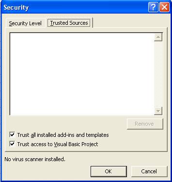 Click the Trusted Sources tab and make sure the Trust Access to Visual Basic Project is checkmarked.  If not, it must be clicked on, as shown in the graphic below, or our Visual Basic code will not work.