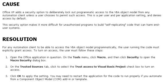 Article Q282830 on Programmatic Access Denied in Microsoft’s Knowledge Base says: