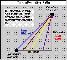 While standing on the shore, given top running and swimming speeds and the location of a struggling swimmer in x and y coordinates, the lifeguard must decide how far to run before diving in the water. While running is faster, it also increases the total distance that must be covered.